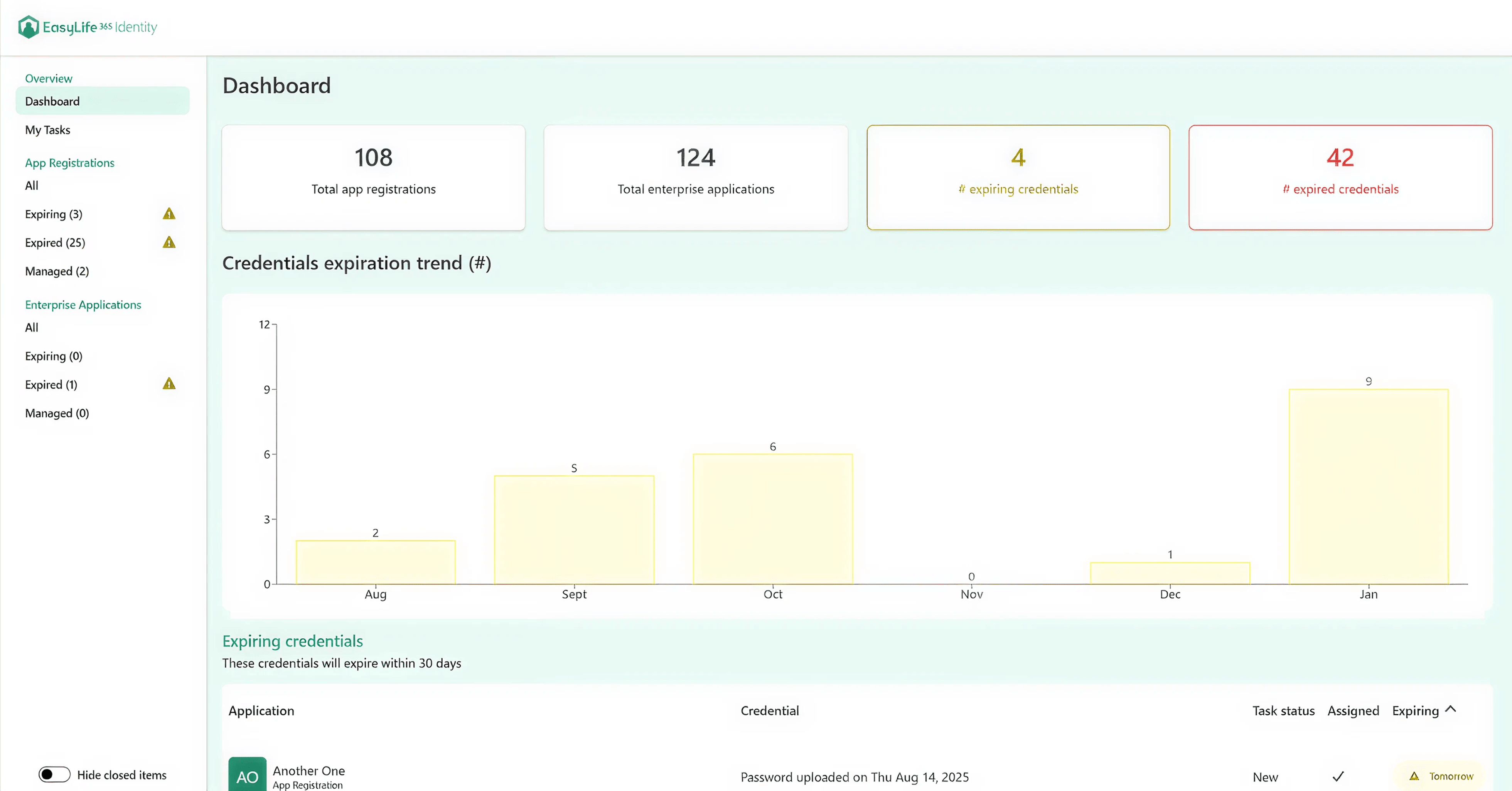 | Expiring credentials overview in EasyLife 365 Identity dashboard. |