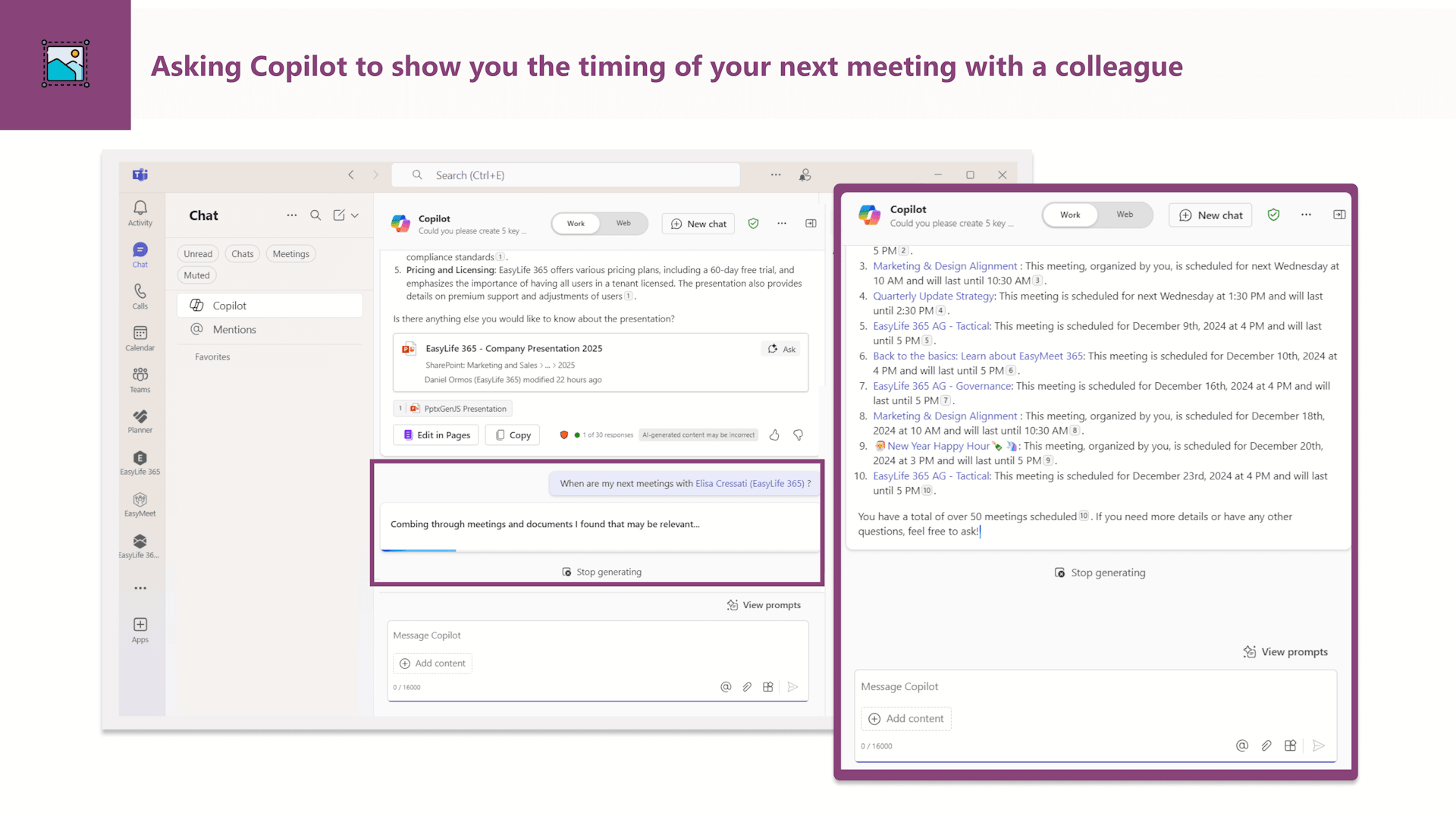 This will give you answers based on your real data. You can also make more articulated questions. For example, I like to ask Copilot to suggest what I should be focusing on the next week based on my meetings, my deadlines, and requests that came through Microsoft Teams chat or Outlook: