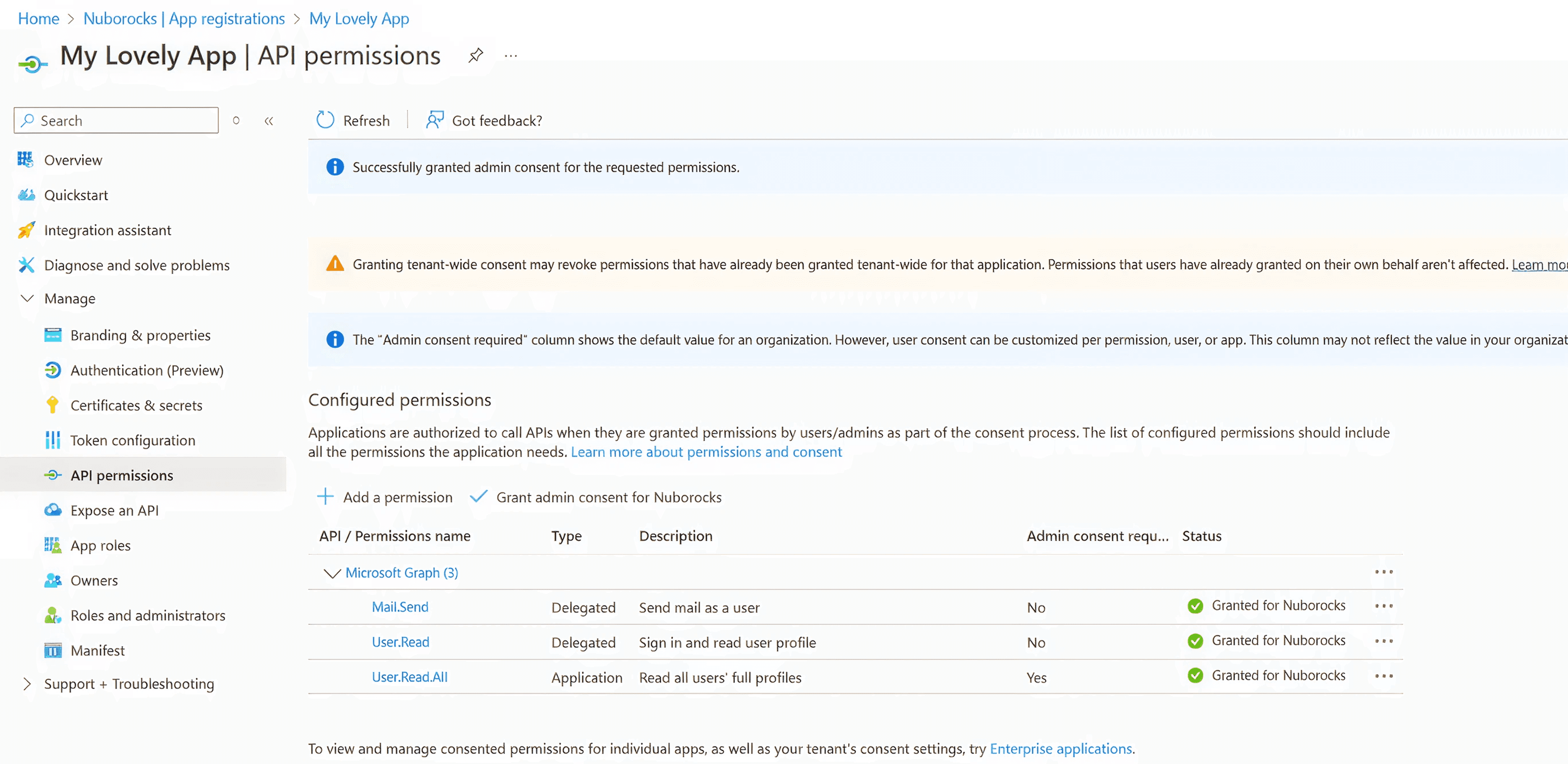 To manage these permissions, administrators can use the API permissions blade within the app registration settings in the Entra admin portal.